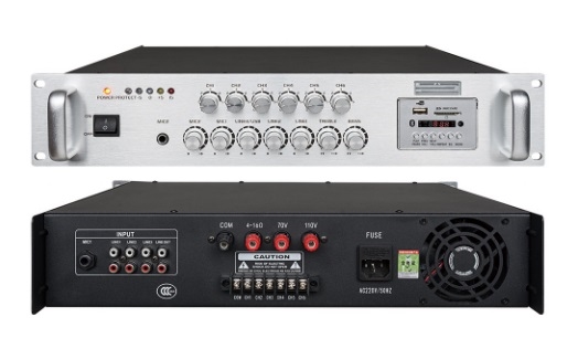 2 микрофонных входа (MIC 1 с функцией бесшумного подключения, удобно для экстренного оповещения), 3 аудиовхода, 1 аудиовыход с регулировкой высоких и низких частот, 6 выходов, независимая регулировка громкости каждого выхода